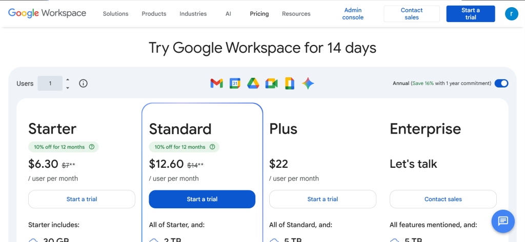 Pricing: Included with Google Workspace. Business Starter ~$7/user/month (annual). Business Standard ~$14/user/month. Business Plus ~$22/user/month. Enterprise custom pricing.