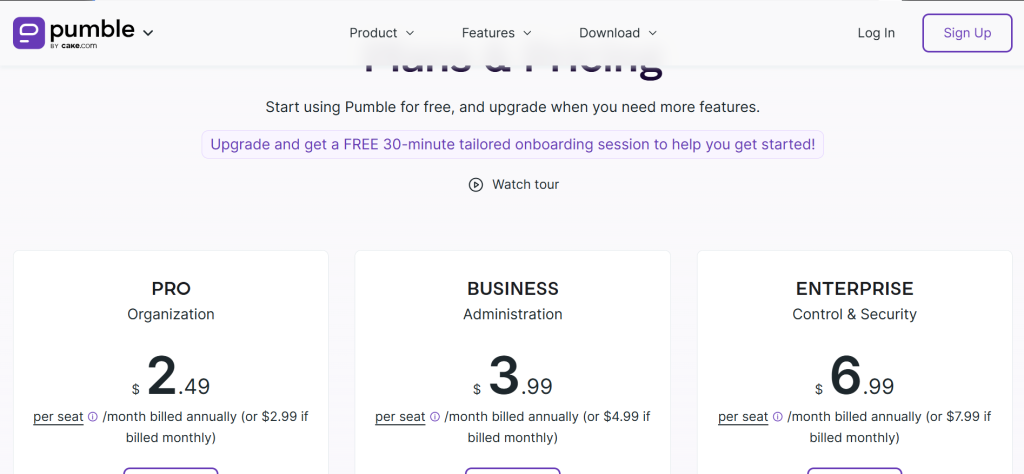 Why it’s a great Slack alternative: Slack’s free plan blocks message history older than 90 days and caps integrations at 10. Pumble’s free plan has no message history limit, no user cap, and includes video conferencing. A 20-person startup can run on Pumble free indefinitely without losing access to past conversations. The paid plans start at ~$2.49/user/month, which is 66% cheaper than Slack Pro.