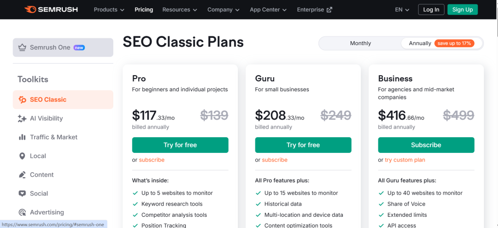 | Starting Price | $139/mo (Pro). Semrush One with AI tools at higher tiers |