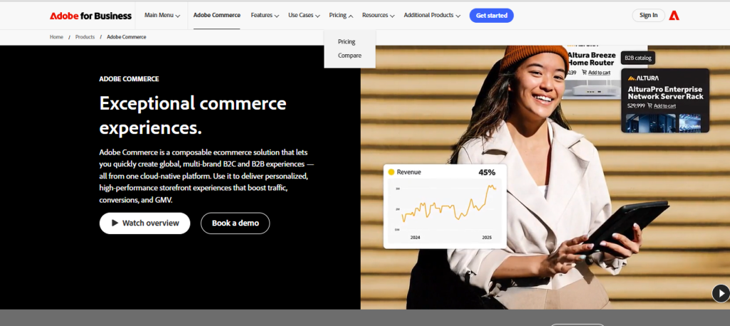 Real-World Insight: BigCommerce’s sweet spot is merchants in the $500k-$5M revenue range who’ve outgrown Shopify’s transaction fees but aren’t ready for Adobe Commerce’s complexity. The platform particularly excels for B2B operations with its native quote system, customer-specific pricing, and purchase order workflows—features Shopify requires expensive apps to match.